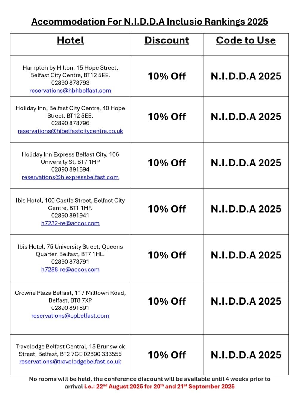 There is a list of hotels doing 10% discount on their rooms for this, they are within the Belfast City centre area and are a short taxi journey away from the venue, roughly 10 minutes of a journey, feel free to use these if they help or go with something you can find nearer to the venue, this is just to give you options.